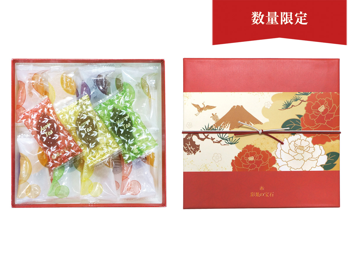 水あめ(国内製造)、グラニュー糖、還元パラチノース、パラチノース、紅茶エキス、アンズ果肉、ウメ果肉、マンゴ果肉、イチゴ果肉、バナナ果肉、ピーチ果肉、リンゴ果肉、パイン果肉、レモン果肉、濃縮マスカット果汁、オレンジ果肉、グレープフルーツ果肉、濃縮プルーン果汁、ブドウ果肉、キウイ果肉、濃縮リンゴ果汁、濃縮パイン果汁、濃縮ピーチ果汁、濃縮グレープフルーツ果汁、ブドウ果汁、ブルーベリー果肉、濃縮レモン果汁、濃縮キウイ果汁、濃縮オレンジ果汁、濃縮ウメ果汁、濃縮ラズベリー果汁、ラズベリー果肉、濃縮バナナ果汁、濃縮アンズ果汁、濃縮イチゴ果汁、濃縮カシス果汁、果実酒、しそ粉末/ゲル化剤(ペクチン)、乳化剤、pH調整剤、香料、着色料(紅花黄、クチナシ、アカキャベツ)、(一部にオレンジ・もも・りんご・バナナ・キウイフルーツを含む)