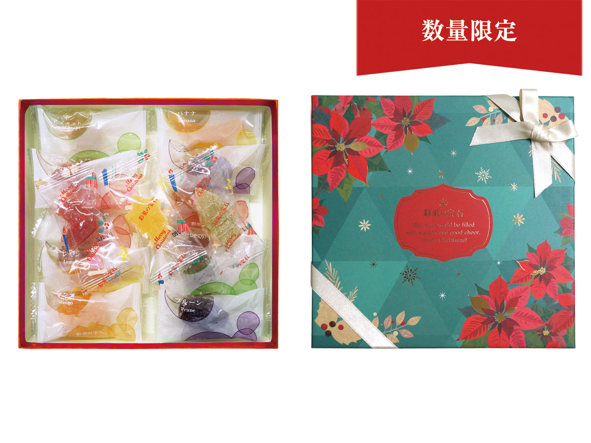 もも、りんご、レモン、ぶどう、パイン、赤うめ(しそ入り)、バナナ、青うめ、オレンジ、いちご、グレープフルーツ、マスカット、プルーン、あんず、ラズベリー、キウイ、マンゴ、ブルーベリー、星(レモン)、ブーツ(いちご)、ツリー(りんご)